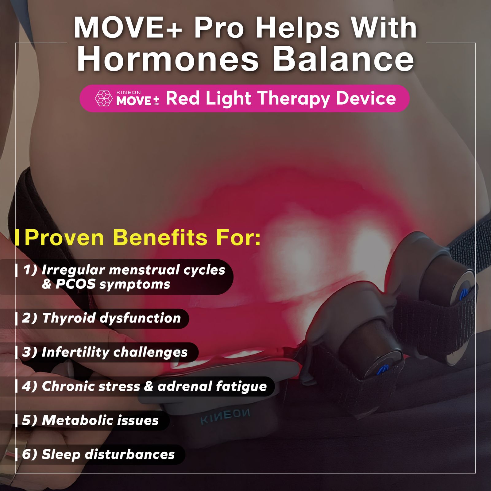 The KINEON MOVE+ Pro is a portable, science-backed solution that is natural, drug-free & non-intrusive, it helps with pain relieve, reduce inflammation, increase mobility and speed up recovery. It uses red (660nm) and near-infrared (850nm) light to support your body’s healing—right where you need it most.